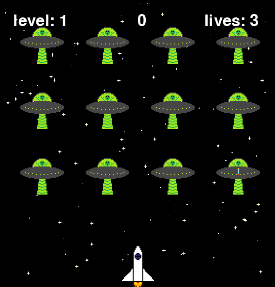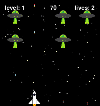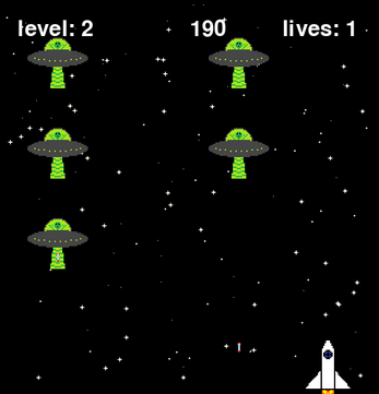 This version of Galaga is not like the original. The art was made by me, and I hope you like the game. You shoot the aliens and try not to get shot. The collision detection is a little weird but it still is a fun game.